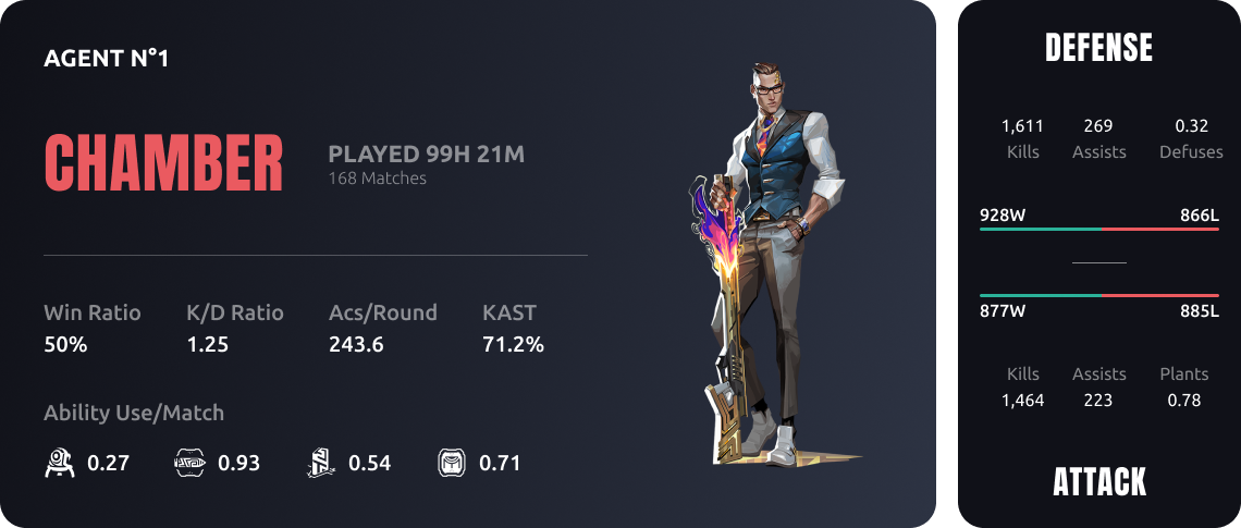 Agent cards show your performance on your 3 best agents played with stats that can help you to be the best!